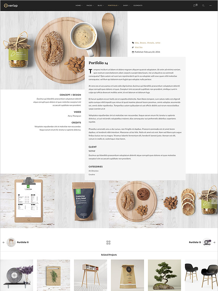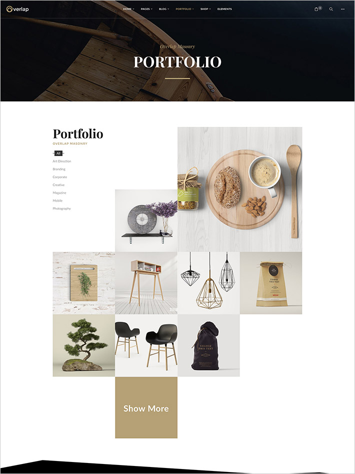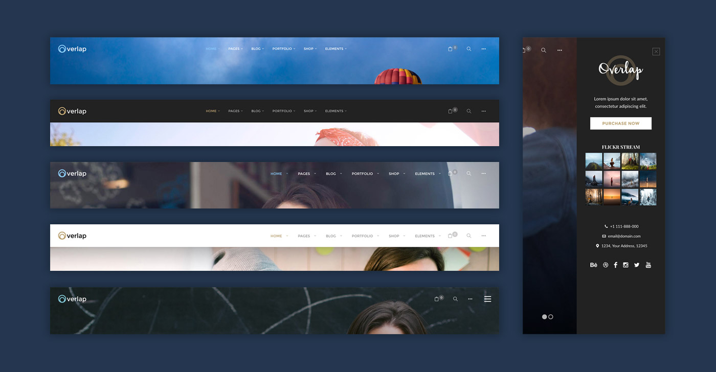 Overlap includes 3 navigation templates, Classic, Center and Fullscreen. Dark & light style with sliding bar widgets.